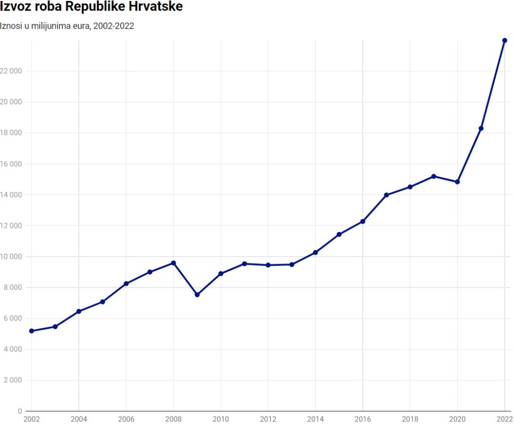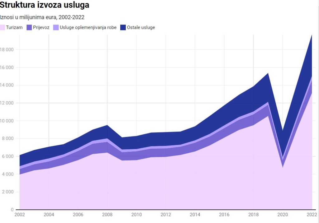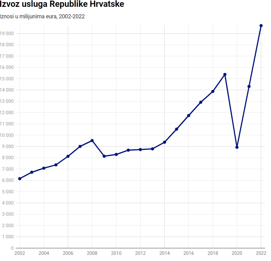 Na grafikonu 4. može se vidjeti kretanje izvoza hrvatskih usluga u milijunima eura za isto dvadesetogodišnje razdoblje. Smisleno je kako se izvoz usluga kretao sličnom dinamikom kao i robni izvoz (grafikon 1.), izuzev 2020. godine u kojoj je veći šok izazvan na tržištu usluga naspram tržišta roba pa je te godine izvoz usluga pao na razinu godina oporavka od svjetske financijske krize (2009.-2013.). Usprkos drastičnom padu uzrokovanom globalnom pandemijom, vidljivo je kako se već iduće godine vrijednost izvoza usluga približila „pretpandemijskoj“ vrijednosti (tzv. rekordnoj godini u turizmu) iz 2019. godine, a trend rasta nastavio se u 2022. godini.