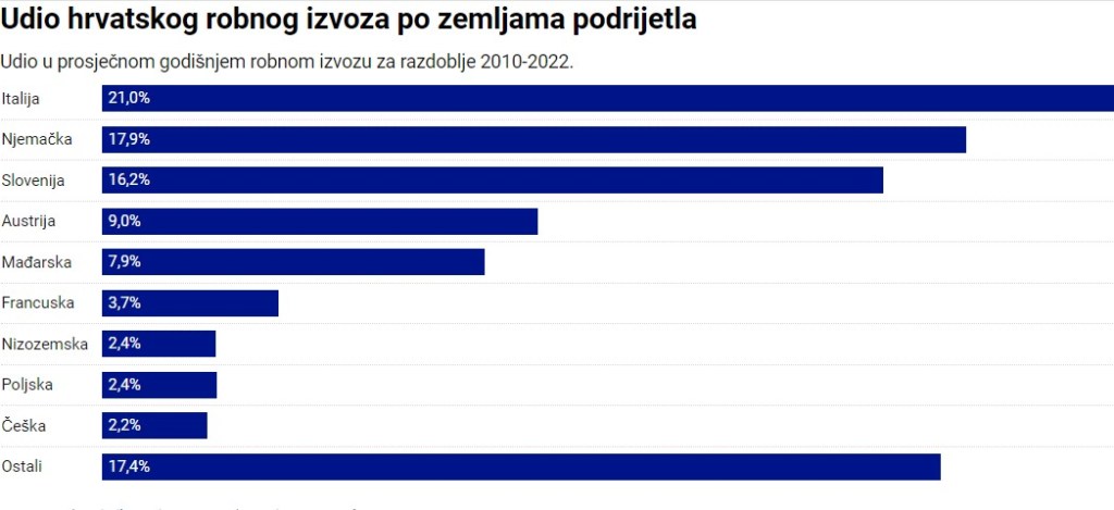 Na grafikonu 2. predstavljena je prosječna godišnja vrijednost robnog izvoza prema najvećim EU uvoznicama hrvatskih proizvoda u periodu od 2002. do 2022. godine. Iz grafikona je vidljivo kako Italija, Njemačka i Slovenija prednjače po vrijednosti uvoza hrvatskih roba, od kojih najveći ima Italija sa preko 1,8 milijardi eura. Nekoliko je faktora koji utječu na kvalitetu i količinu prekogranične suradnje Hrvatske s navedenim zemljama od kojih su prema (Papić, 2018) ključni: