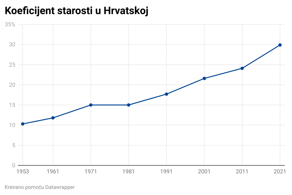 Drugi demografski pokazatelj koji je bitan za održivost mirovinskog sustava u Hrvatskoj je koeficijent starosti koji prikazuje postotni udio osoba u dobi od 60 i više godina u ukupnom stanovništvu. Ovo je osnovni pokazatelj razine starosti i ako je veći od 12%, to znači kako stanovništvo opisivanog područja kontinuirano stari. U Hrvatskoj je 70-tih godina ovaj koeficijent već bio veći od 12%, i do zadnjeg popisa 2021. godine je narastao na skoro 30%.