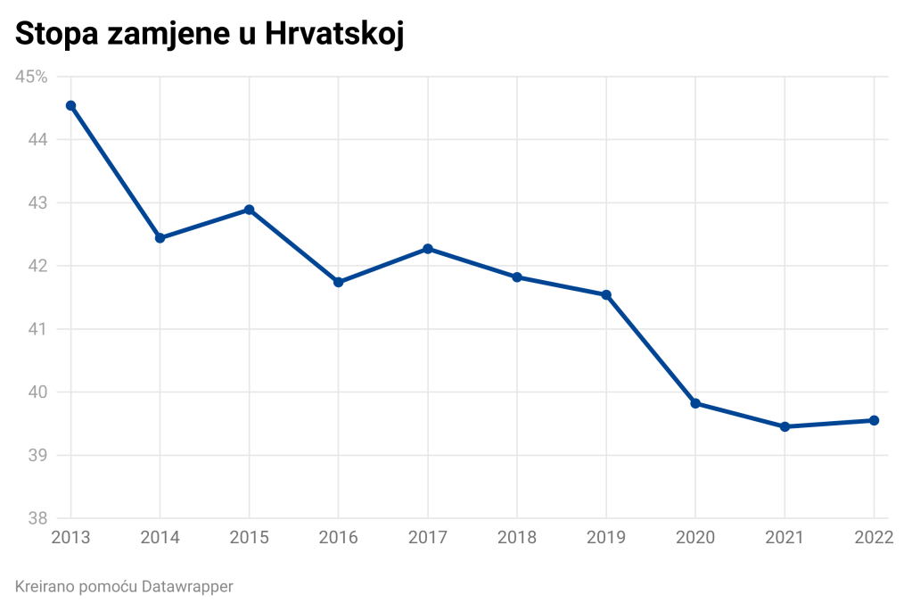 Ovakva demografska situacija dovodi do toga da sve manji broj radnika osigurava mirovine za sve veći broj umirovljenika. U slučaju kada se država, kao što to radi Hrvatska, većinski oslanja na sistem međugeneracijske solidarnosti iznos isplaćivanih mirovina pati. Tako je vidljivo kako je u Hrvatskoj stopa zamjene u zadnjih 9 godina pala sa 44,54% na 39,55%. Stopa zamjene predstavlja omjer medijana bruto mirovine i bruto plaće u jednoj državi. To znači da je u 2022 medijalna bruto mirovina iznosila tek 39,55% medijalne bruto plaće, a kao rezultat značajno bržeg rasta medijalne bruto plaće od medijalne bruto mirovine.