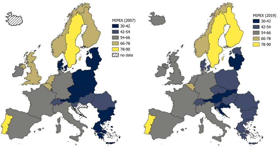 Može se primijetiti kao zemlje istočne Europe imaju najniže vrijednosti MIPEX indeksa, dok zemlje sjeverne Europe (uz iznimku Danske) bilježe najviše vrijednosti. Švedska se primjerice nalazi na samom vrhu ljestvice s 86 bodova. Njihovo izvješće navodi kako su švedske politike komparativno uspješnije od drugih promatranih zemalja pri osiguravanju jednakosti migranata u područjima tržišta rada, obrazovanja i zdravstva, te prednjače po pitanjima borbi protiv diskriminacije i omogućavanju stabilnog puta k stalnom boravku i ostvarivanju državljanstva (MPG, 2020). S druge strane, Švicarska i Austrija, koje stavljaju veću premiju na integraciju putem asimilacije, rangiraju niže na indeksu. Za Švicarsku primjerice, izvješće prosuđuje kako državne integracijske politike potiču švicarsku javnost da na imigrante gledaju kao na strance te da ih se time ne tretira kao jednake građane, prvenstveno se referirajući na nedostatak anti-diskriminacijskog zakona i usporedivo dugotrajnog i kompliciranog puta prema ostvarivanju državljanstva u odnosu na ostale države Zapadne Europe.