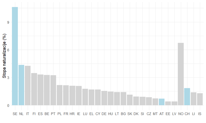 Graf 1. Stopa naturalizacije u Europi, 2022.