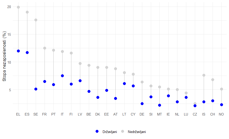 Na grafu 2. predstavljeni su recentniji podaci o stopama nezaposlenosti državljana i ne-državljana. Vidljivo je kako Švedska ima najveću apsolutnu razliku u dvjema stopama nezaposlenosti, što dodatno stavlja upitnik pred zaključak o uspješnosti tamošnje integracije migranata na tržište rada. Razlog za niže stope zaposlenosti imigranata u zemljama poput Švedske nalazi se prvenstveno u tome što integracijske politike koje useljenicima omogućavaju jednostavan i sveobuhvatan pristup državnim socijalnim programima smanjuju ekonomski trošak nesudjelovanja na tržištu rada te ograničavaju push faktore za poboljšanje konkurentnosti migranata u odnosu na domicilno stanovništvo (Koopmans, 2010). Uz to, multikulturalizam potencijalno može potaknuti migrante da se okrenu isključivo svojoj etničkoj zajednici, što usporava učenje jezika i razvoj društvenih kontakata bitnih za integraciju na tržište rada, dok asimilacija po definiciji zahtijeva jezičnu i kulturalnu prilagodbu.