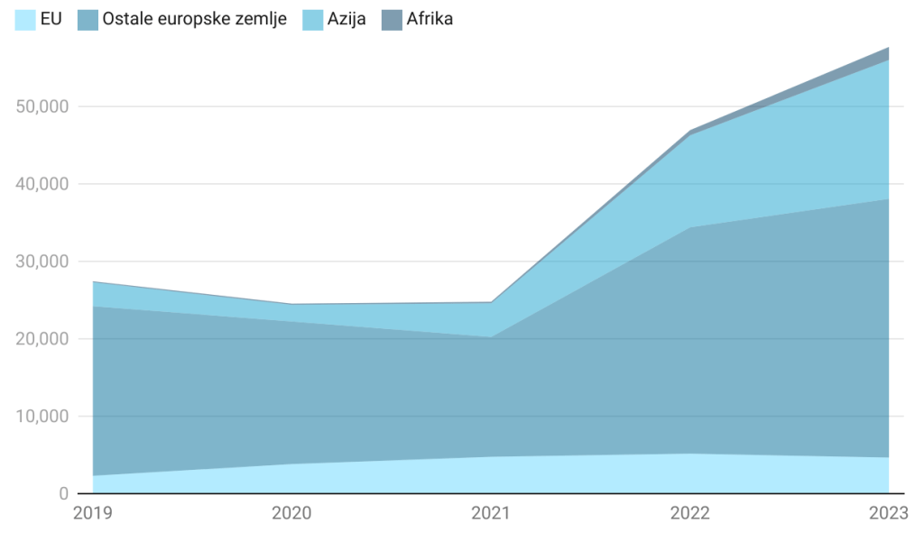 Kada je riječ o strukturi imigranata, najznačajniji broj njih dolazi iz ostalih europskih zemalja izvan Europske unije, što uključuje države poput Bosne i Hercegovine, Srbije, Albanije i Sjeverne Makedonije. Također, bilježi se trend povećanja imigracije iz Azije, a naročito iz zemalja kao što su Nepal, Indija i Filipini.